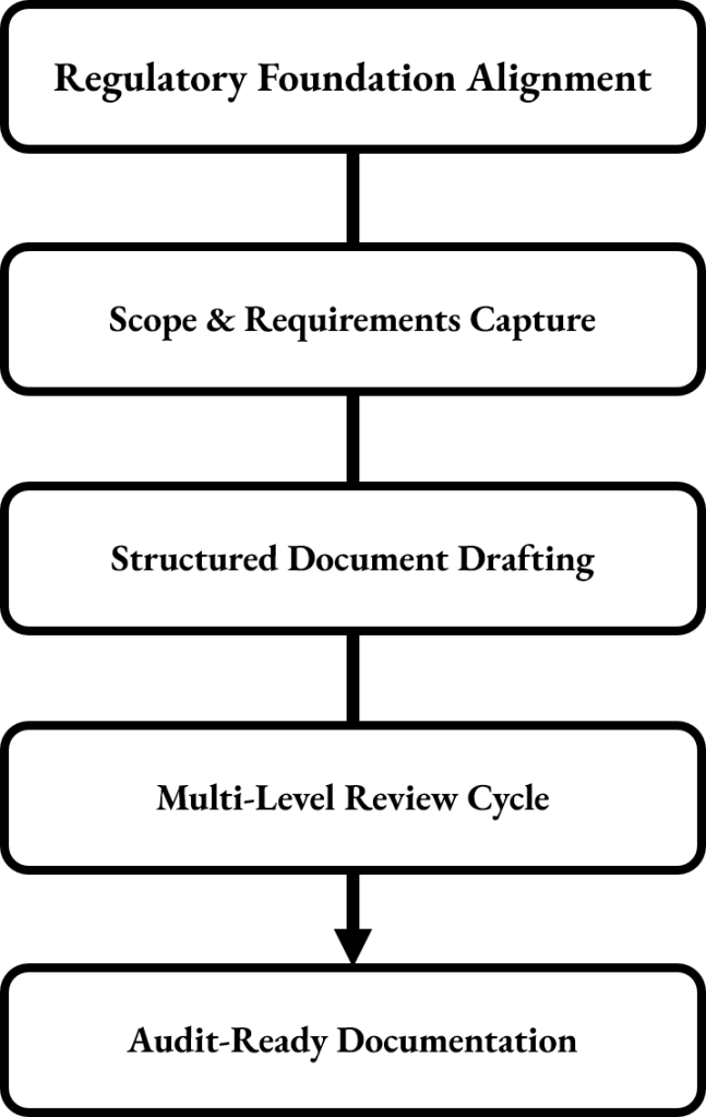 This method provides audit-ready Validation and QA documentation that easily integrates into existing Quality Management System (QMS). The service exceeds basic document creation by using a structured, regulatory-aligned approach that ensures clarity, traceability, and long-term compliance across all deliverables.