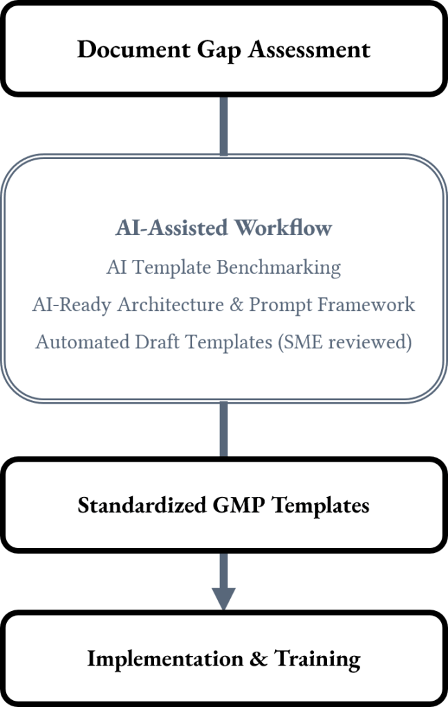 This service goes beyond just organizing documents by turning fragmented, inconsistent GMP documentation into a stable, controlled template system that teams can depend on. It aims to eliminate repetitive rewriting, reduce variability among authors, and ensure each new document begins with a compliant, audit-ready foundation.